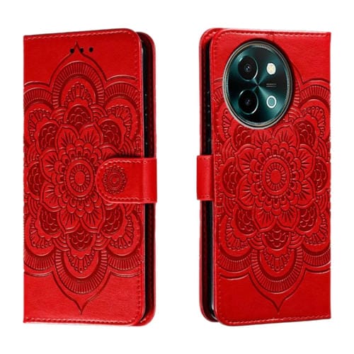 Para Vivo Y38 Sun Mandala Funda de Cuero para Teléfono con Patrón En Relieve (Rojo)