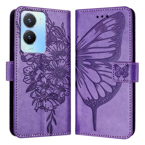 Para Vivo Y56 5G / Y16 4G / Y02S 4G Funda para Teléfono de Cuero con Mariposa En Relieve Global (Púrpura Claro)