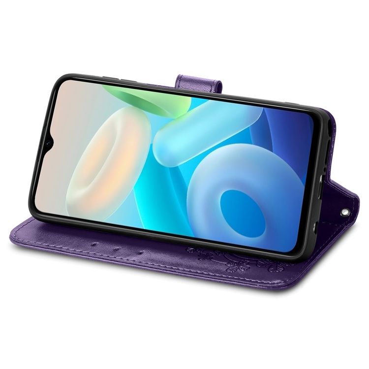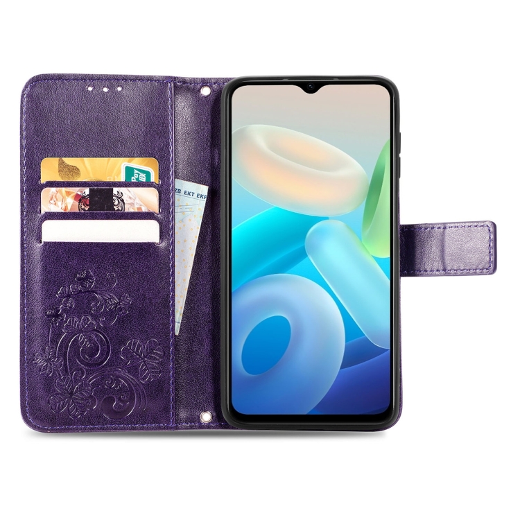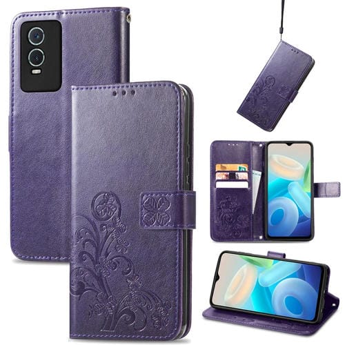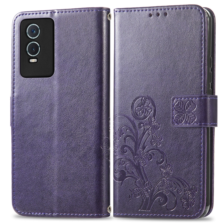 Para Vivo Y76S Funda de Cuero En Relieve de Cuatro Hojas (Púrpura)