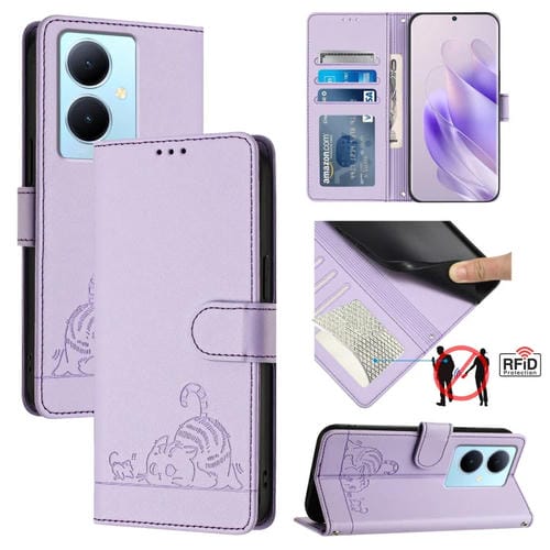 Para Vivo Y78 + 5G Global Cat Rat Estuche para Teléfono de Cuero Rfid con Patrón En Relieve y Cordón (Púrpura)