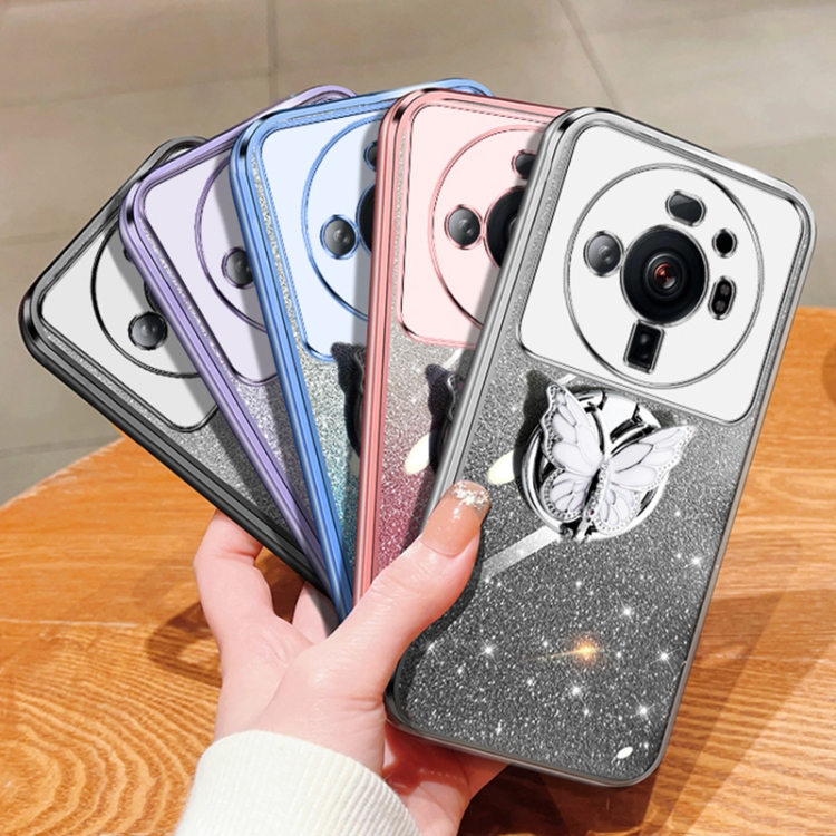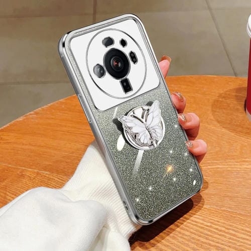 Para Xiaomi 12S Funda para Teléfono de TPU con Soporte de Mariposa con Brillo Degradado Ultra Plateado (Plata)