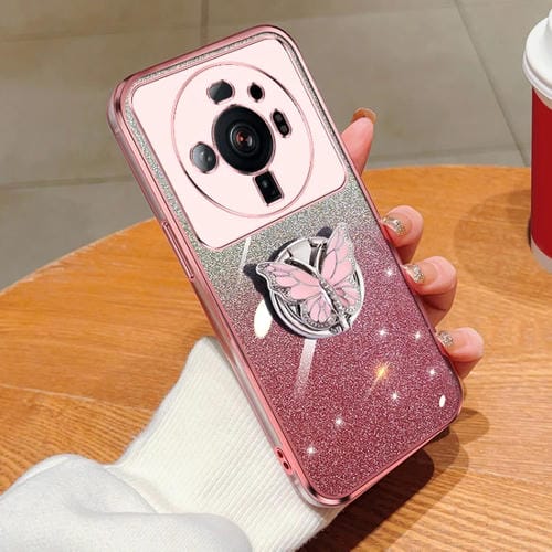 Para Xiaomi 12S Funda para Teléfono de TPU con Soporte de Mariposa con Brillo Degradado Ultra Plateado (Rosa)