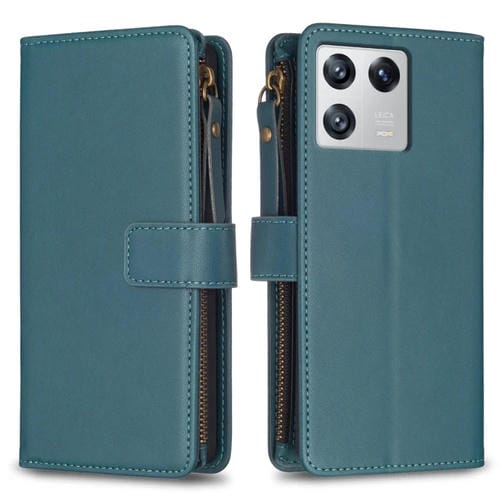 Para Xiaomi 13 9 Ranuras para Tarjetas Cremallera Cartera Funda de Cuero con Tapa para Teléfono (Verde)
