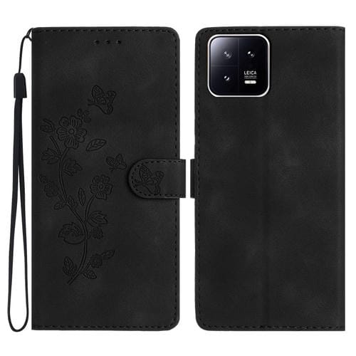 Para Xiaomi 13 Pro Flor Mariposa Relieve Patrón Funda de Cuero para Teléfono (Negro)