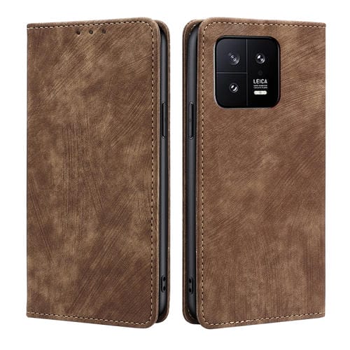 Para Xiaomi 13 Rfid Funda de Teléfono de Cuero Magnético con Cepillo Antirrobo (Marrón)