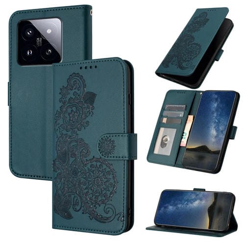 Para Xiaomi 14 Pro Datura Flower Funda De Teléfono De Cuero Con Tapa En Relieve (Verde Oscuro)