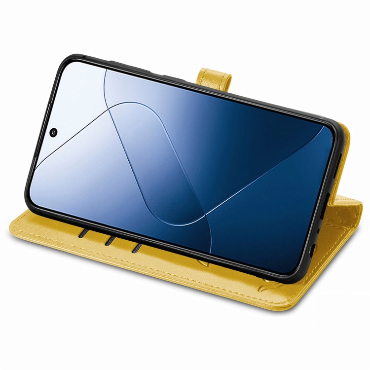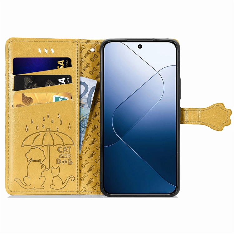 Para Xiaomi 14 Pro Funda De Teléfono De Cuero Con Relieve De Perro Y Gato (Amarillo)
