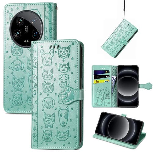Para Xiaomi 14 Ultra Funda De Cuero Con Relieve Para Gatos Y Perros (Verde)
