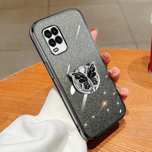 Para Xiaomi Mi 10 Lite Funda para Teléfono de TPU con Soporte de Mariposa con Brillo Degradado Plateado (Negro)