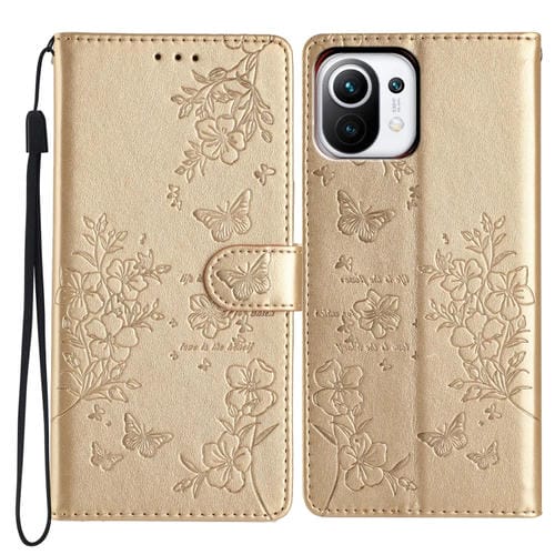 Para Xiaomi Mi 11 Lite Funda de Cuero para Teléfono con Mariposas y Flores (Dorado)