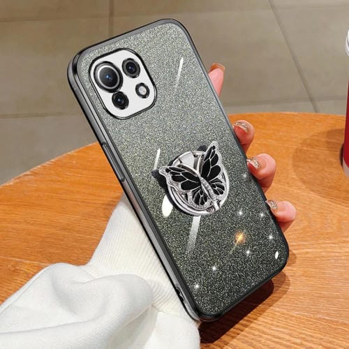 Para Xiaomi Mi 11 Lite Funda para Teléfono de TPU con Soporte de Mariposa con Brillo Degradado Plateado (Negro)