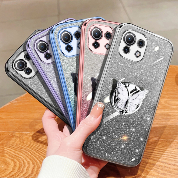 Para Xiaomi Mi 11 Lite Funda para Teléfono de TPU con Soporte de Mariposa con Brillo Degradado Plateado (Plata)