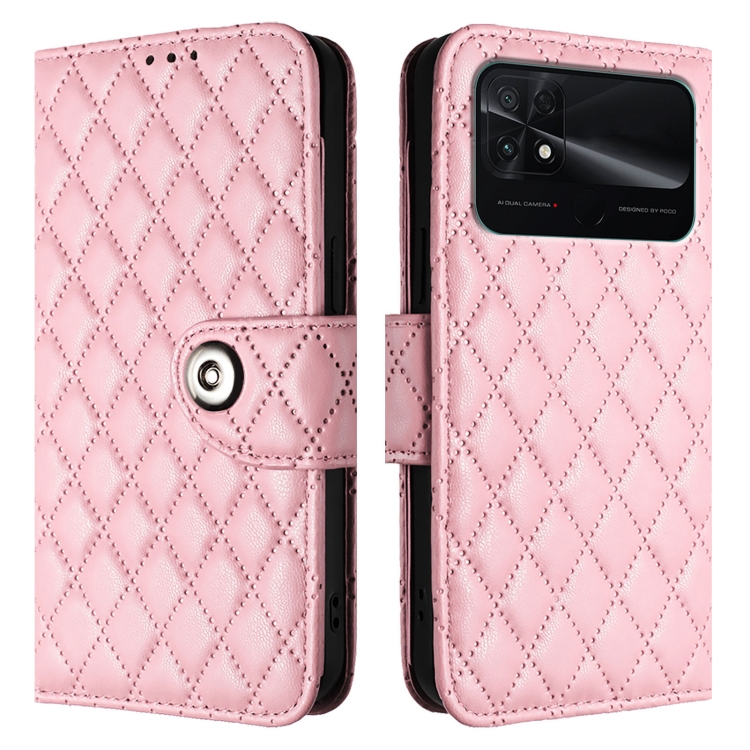 Para Xiaomi Poco C40 Funda para Teléfono de Cuero con Tapa con Textura Rómbica y Cordón (Rosa)