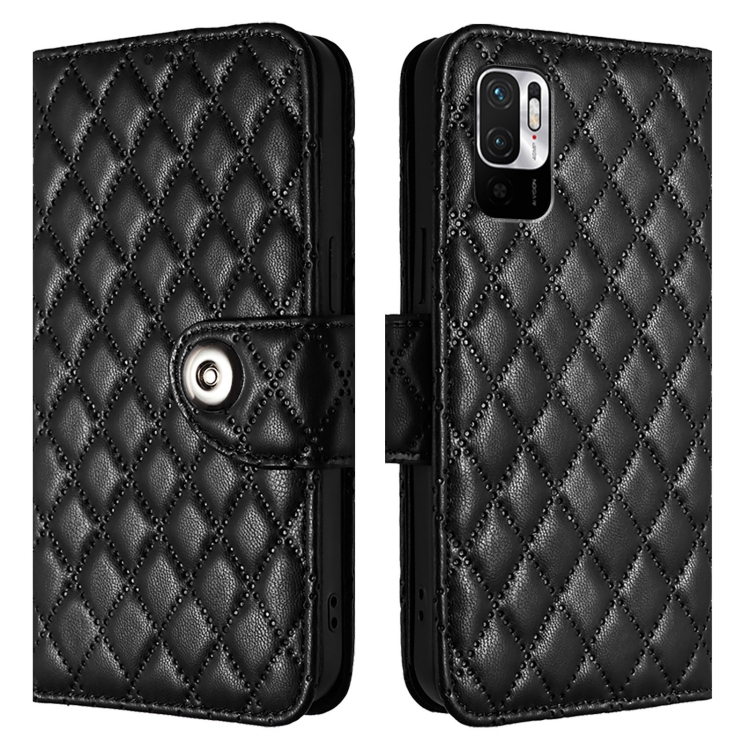 Para Xiaomi Poco M3 Pro Funda de Teléfono de Cuero con Tapa con Textura Rombal y Cordón (Negro)