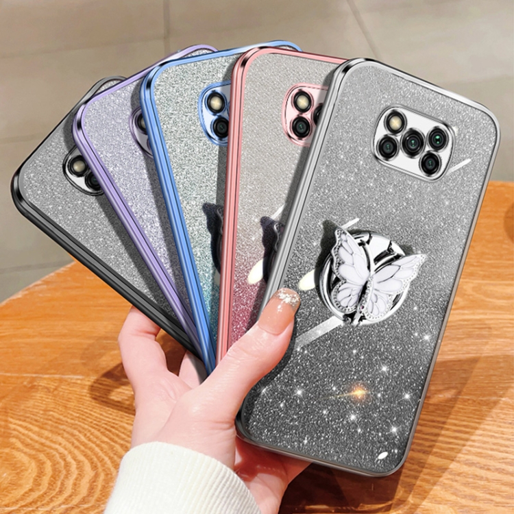 Para Xiaomi Poco X3 Funda para Teléfono de TPU con Soporte de Mariposa con Brillo Degradado Plateado (Plata)