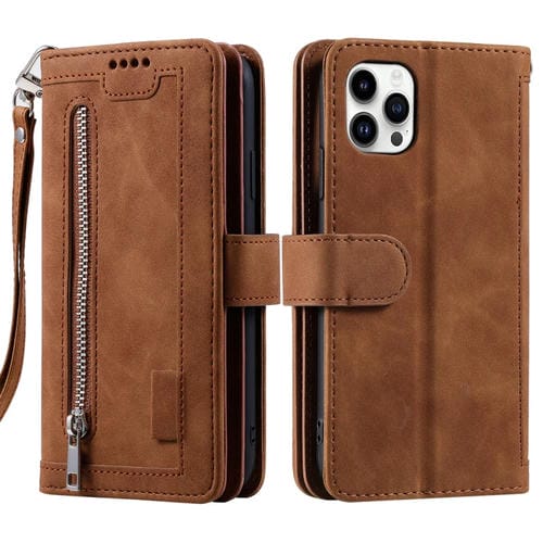 Para Xiaomi Redmi 13 4G Funda de Cuero para Teléfono con Bolsa con Cremallera y Nueve Tarjetas con Cordón (Marrón)