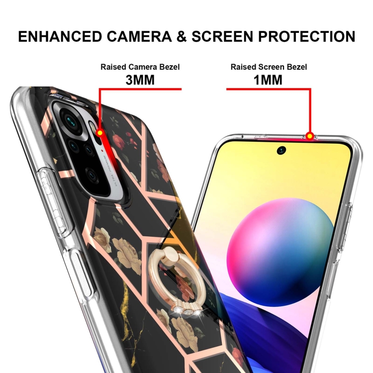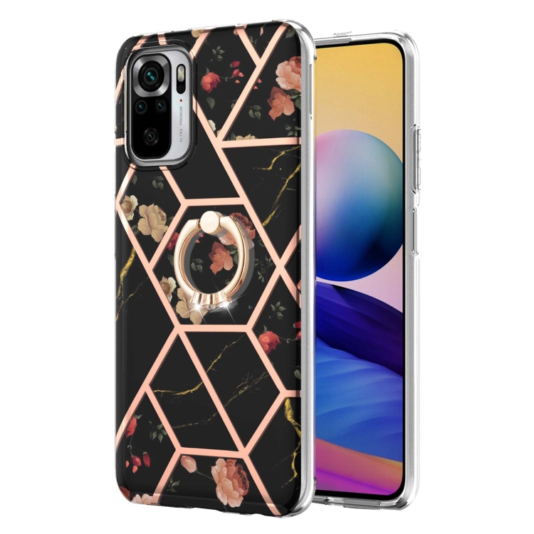 Para Xiaomi Redmi Note 10 electrochaplating empalme patrón de flores de mármol TPU Funda a prueba de golpes con soporte de anillo de diamantes de imitación (flor negra)