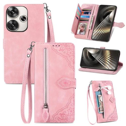 Para Xiaomi Redmi Turbo 3 5G Funda de Cuero con Cremallera y Flores En Relieve (Rosa)