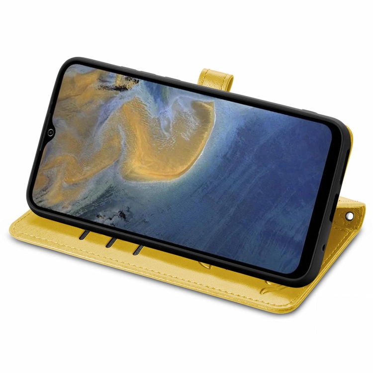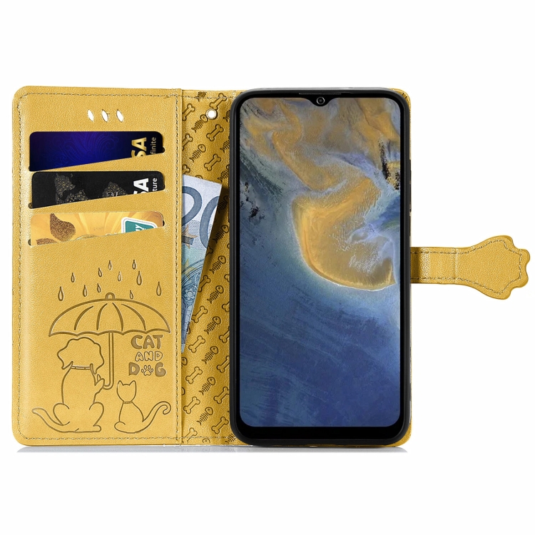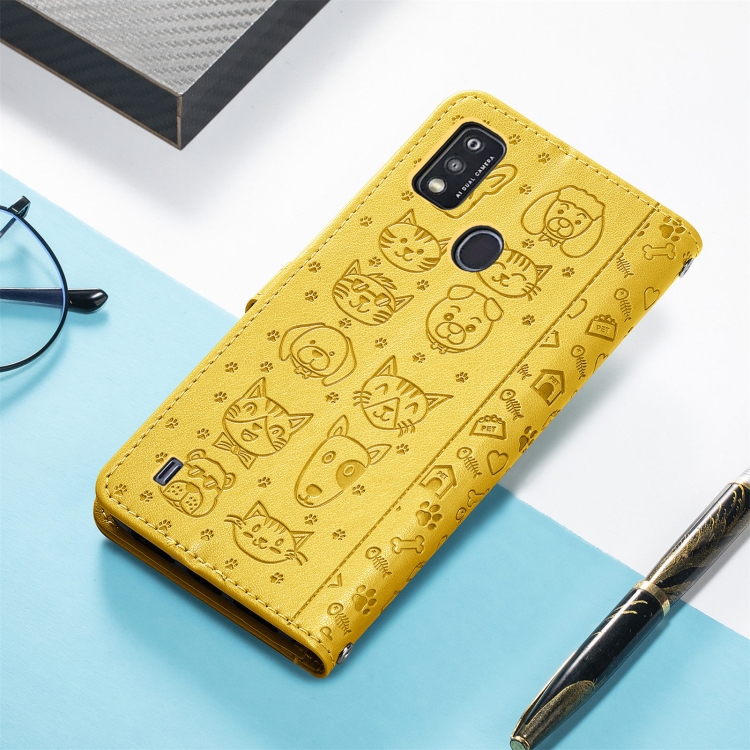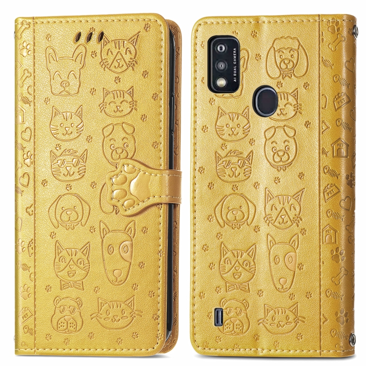 Funda para ZTE A51 con Soporte, Tragamonedas, Billetera y Cordón, Estampado Gato y Perro (Amarillo)