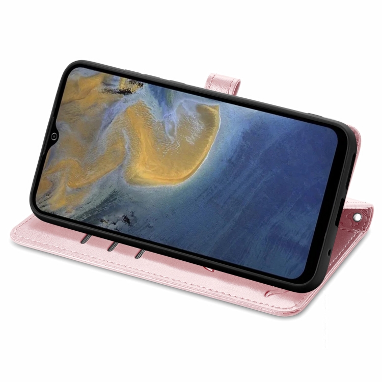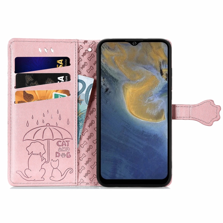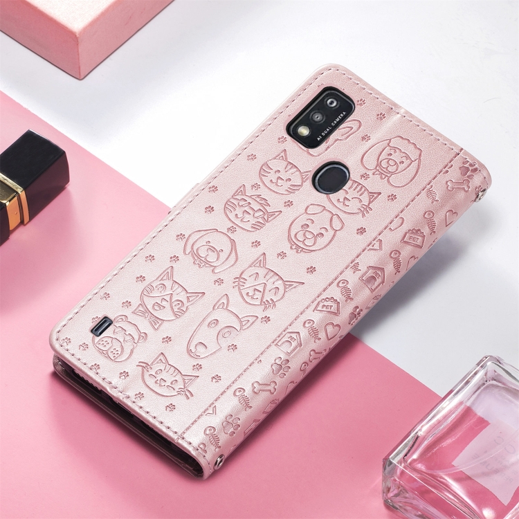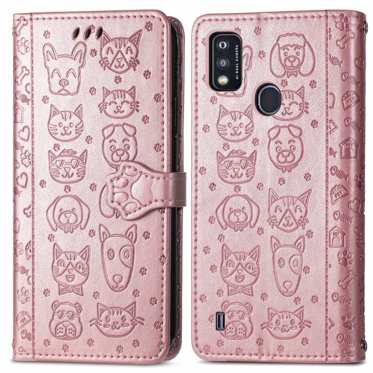 Funda de Cuero para ZTE A51 con Soporte, Tragamonedas, Billetera y Cordón Estampado Gato y Perro (Oro Rosa)