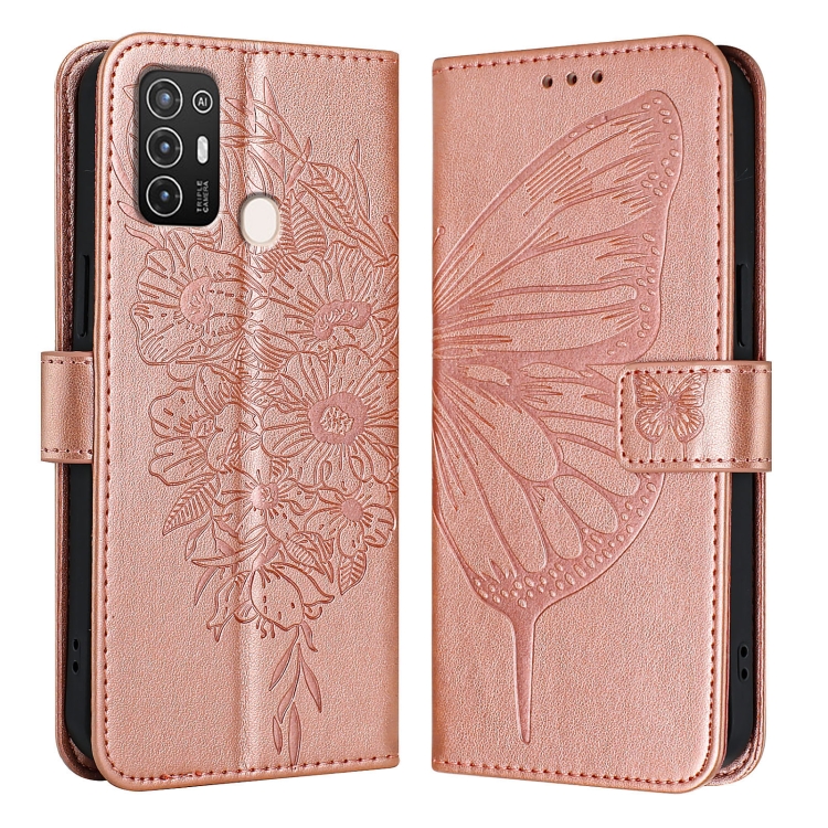 Funda de Cuero para ZTE Blade A52 con Mariposa en Relieve (Oro Rosa)