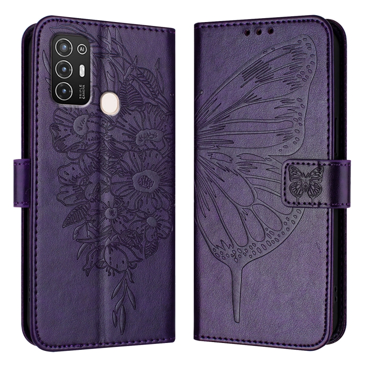 Funda de Cuero para ZTE Blade A52 con Mariposa en Relieve (Púrpura Oscuro)