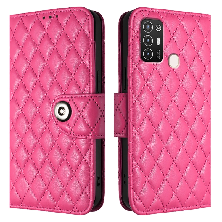 Funda de Cuero para ZTE Blade A52 con Tapa Textura Rómbica y Cordón (Rojo Rosa)