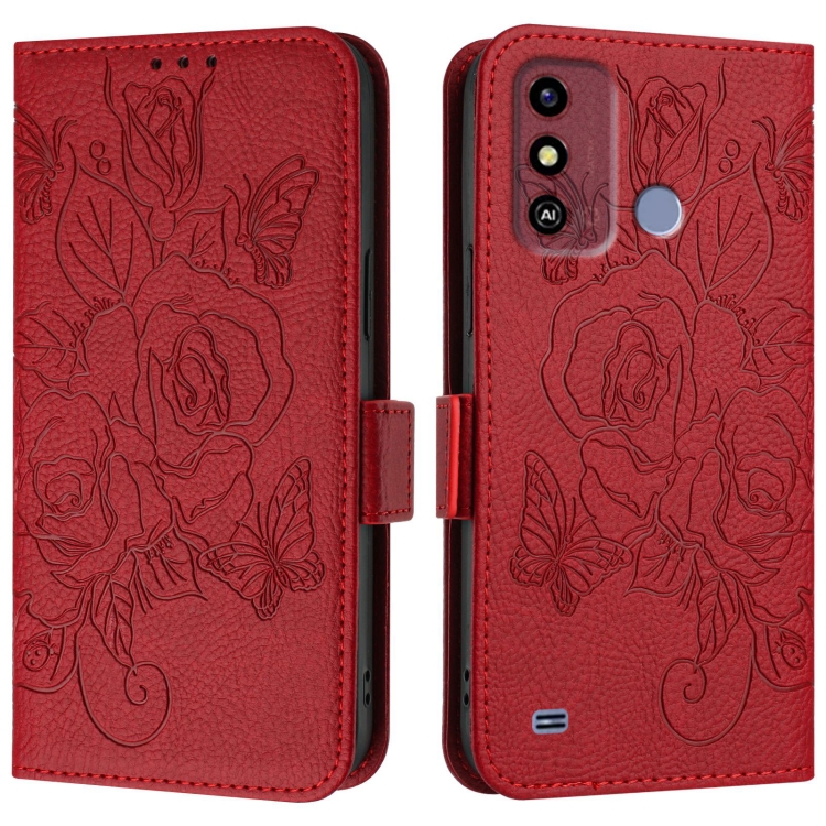 Funda para ZTE Blade A53 de Cuero Antirrobo RFID con Rosa en Relieve (Rojo)