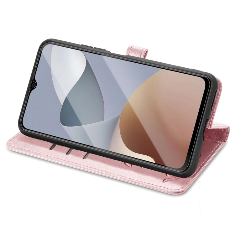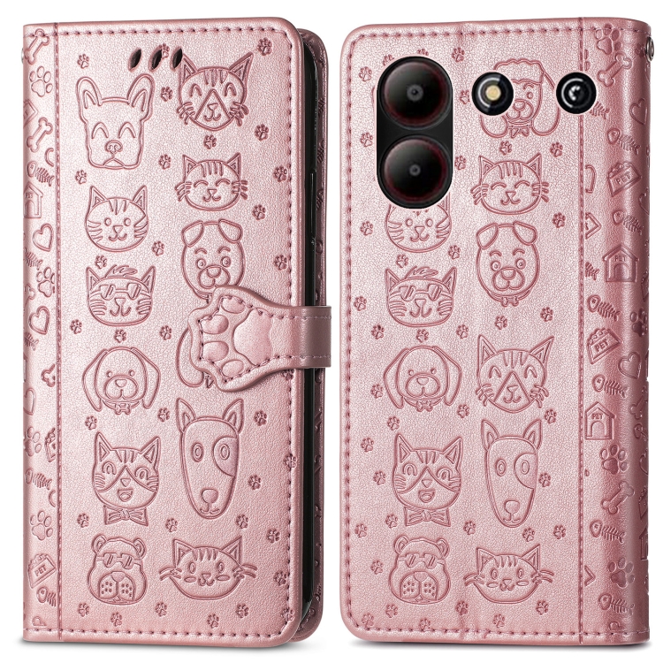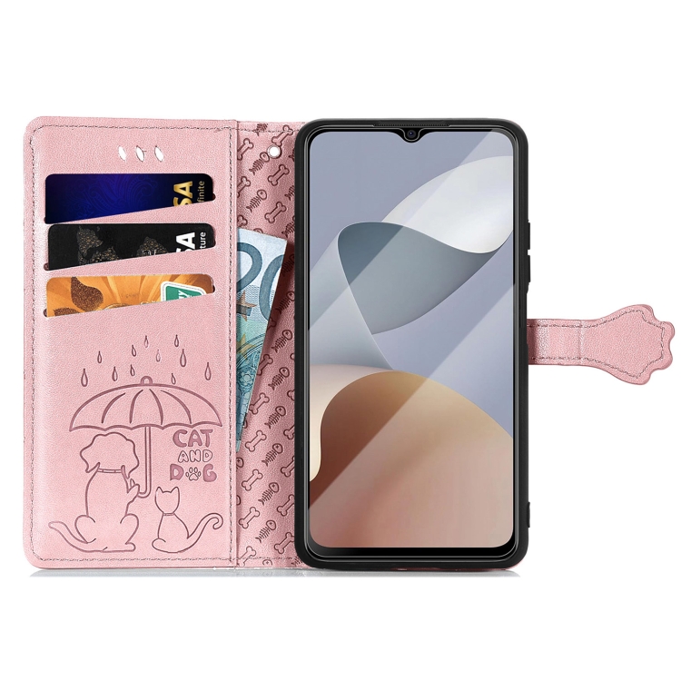 Funda para ZTE Blade A54 de Cuero con Relieve de Gato y Perro (Oro Rosa)