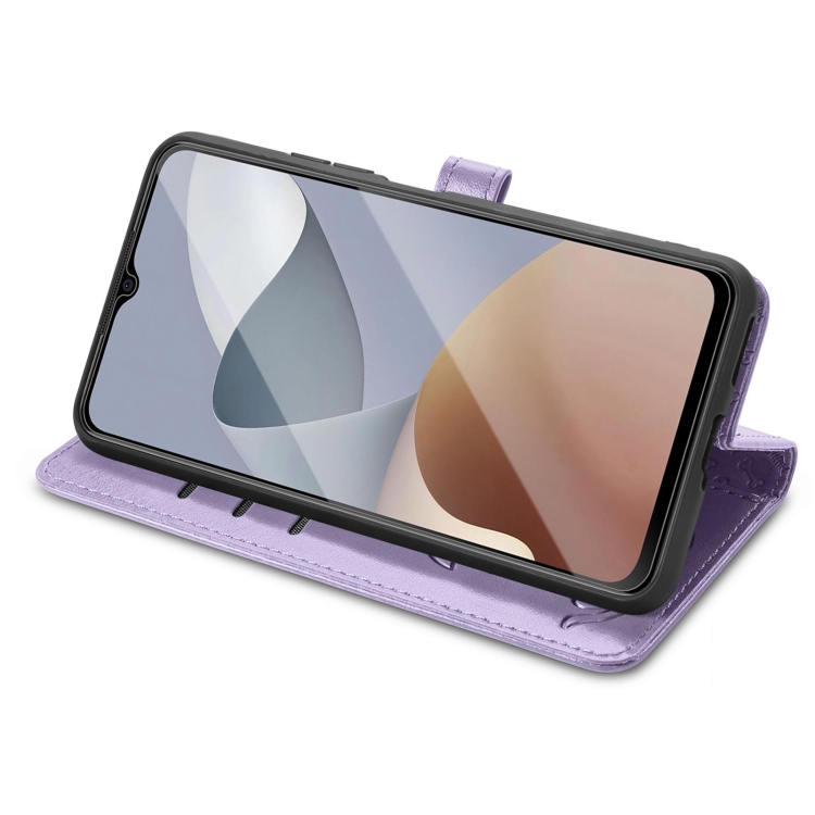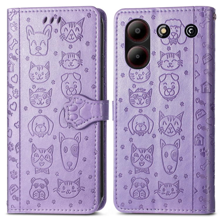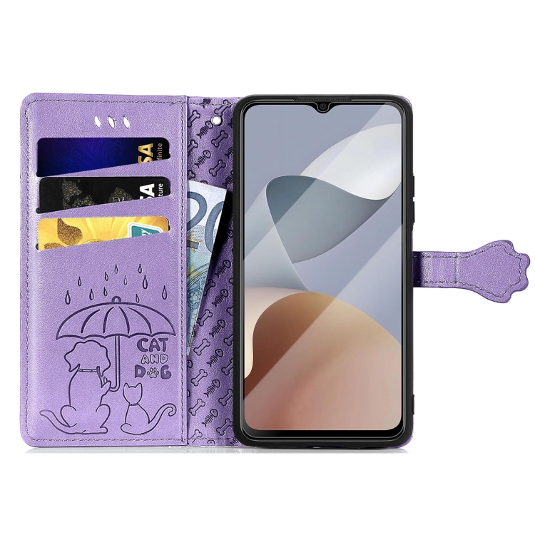 Funda para ZTE Blade A54 de Cuero con Relieve de Gato y Perro (Púrpura)