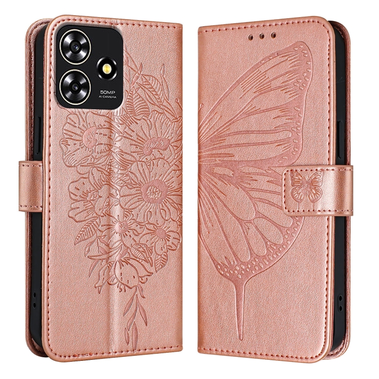Funda de Cuero para ZTE Blade A73 4G con Mariposa en Relieve (Oro Rosa)