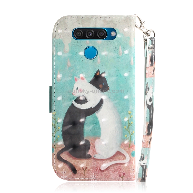 Funda de Cuero con Tapa Horizontal LG Q60 con Soporte y Ranuras Patrón Gato 3D Blanco y Negro