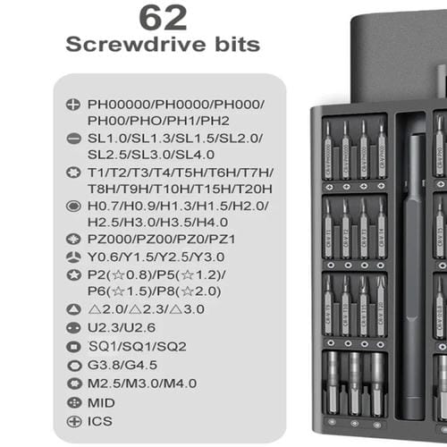 - Amplia variedad de puntas para adaptarse a múltiples tipos de tornillos en dispositivos electrónicos