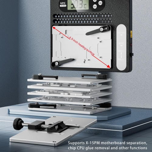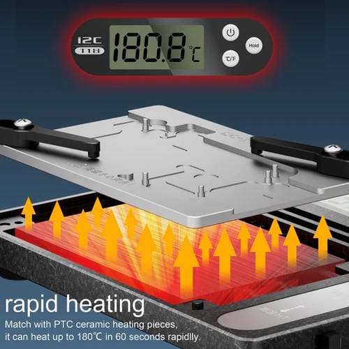 La estación de desoldar en capas T18 con Pantalla LCD i2C es una plataforma de Reparación diseñada para la manipulación precisa de Placas Base PCB de modelos iPhone desde el X hasta el 15 Pro Max. Esta Herramienta profesional permite la separación y unión eficiente de Placas Base, así como la eliminación de pegamento en chips de CPU, optimizando procesos de Reparación electrónica. Su diseño modular magnético facilita el cambio de módulos para adaptarse a diversas tareas, mientras que su control de temperatura constante, que varía entre 180 y 245 grados Celsius, garantiza un desoldado seguro y efectivo. Fabricada en aluminio de aviación con procesamiento CNC, esta estación ofrece resistencia a altas temperaturas y oxidación, asegurando durabilidad y precisión en aplicaciones Técnicas especializadas.