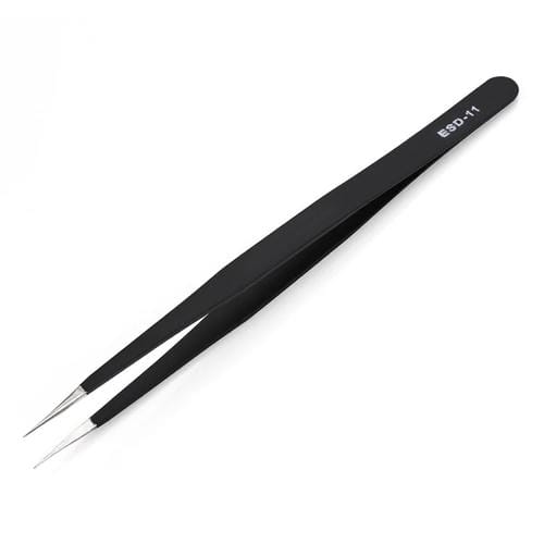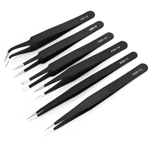 - Incluye 6 tipos de pinzas: ESD-10 (estándar), ESD-11 (punta fina), ESD-12 (alta fuerza elástica), ESD-13 (cabeza redonda), ESD-14 (ultrafina, 12 cm), ESD-15 (punta de águila doblada)