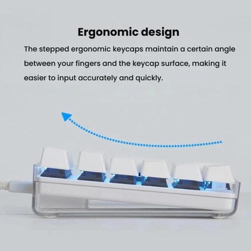 1. Diseño ergonómico con teclas ergonómicas escalonadas que mantienen un ángulo adecuado entre los dedos y la superficie, lo que facilita una escritura correcta y fluida.