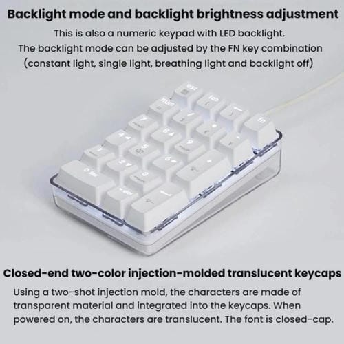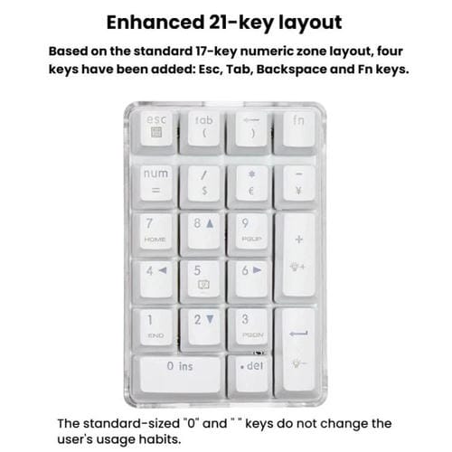 2. Disposición mejorada de 21 teclas, basada en la disposición estándar de 17 teclas numéricas, con cuatro teclas adicionales: Esc, Tab, Retroceso y Fn.