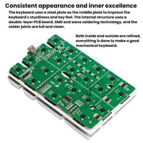 10. Placa central de acero que mejora la robustez del teclado y la sensación de las teclas.El interior utiliza una placa PCB de doble capa, con procesos de montaje superficial y soldadura por ola, con puntos de soldadura limpios y completos.