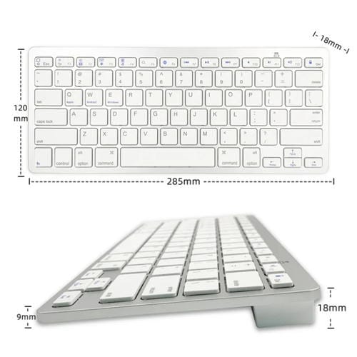 • Bluetooth 3.0 Wireless, 78 teclas, distancia de Conexión hasta 10 metros, teclas de función multimedia, dimensiones 120 x 285 x 18 mm, peso 290 g, requiere 2 Baterías AAA (no incluidas)