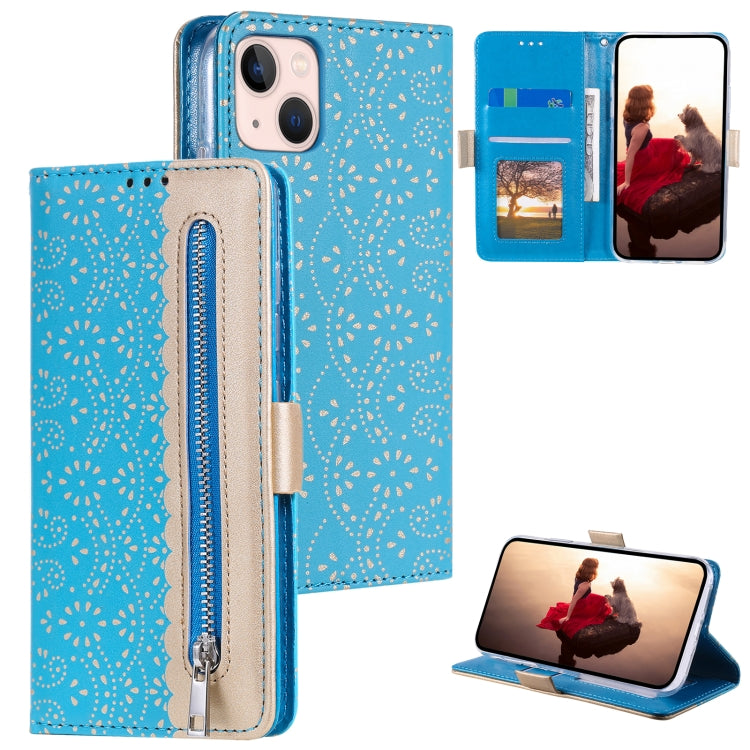 Funda de Cuero para iPhone 15 Plus con Cremallera de Doble Botón Patrón de Encaje y Cordón (Azul)