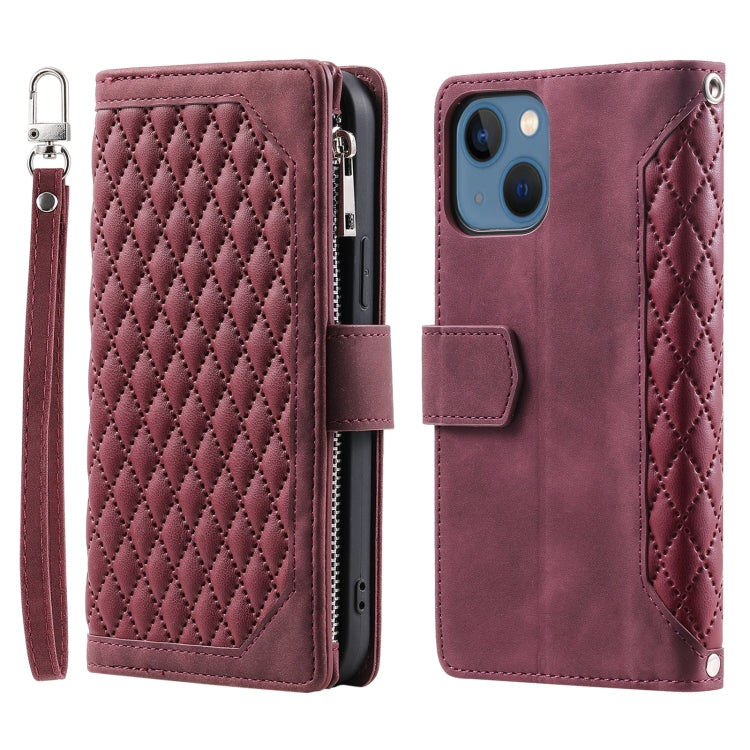 Funda para iPhone 15 Plus de Cuero con Cremallera Textura de Rejilla y Cordón (Rojo Vino)