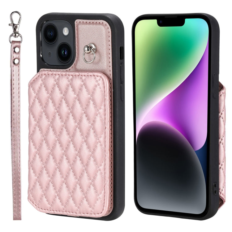Estuche para Teléfono iPhone 15 Plus con Bolsa para Tarjetas Textura de Cuadrícula y Cordón (Oro Rosa)