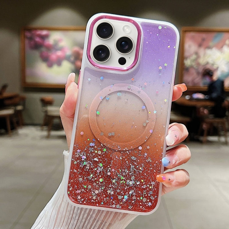 Funda para Teléfono iPhone 15 Pro Max Magsafe TPU con Lentejuelas y Brillo Degradado (Púrpura + Rojo)