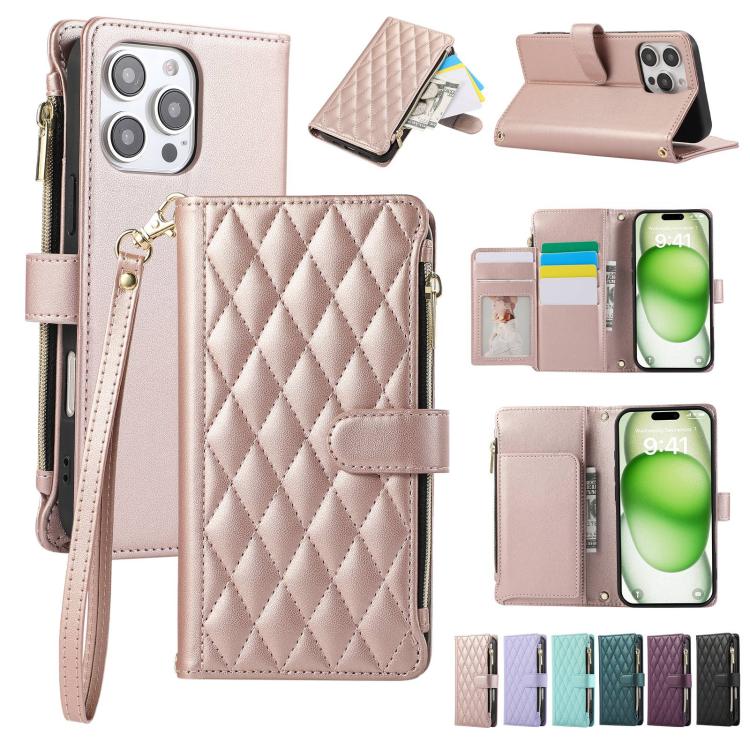 Funda de Cuero Tipo Billetera con Cremallera Rombal para iPhone 16 Pro Max (Oro Rosa)