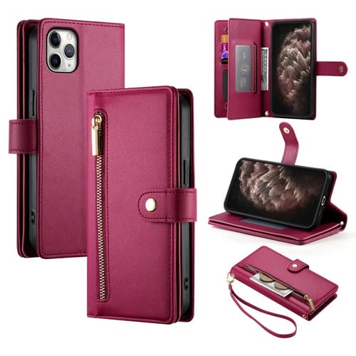 Funda de Cuero para Teléfono iPhone 11 Pro Max con Nueve Ranuras para Tarjetas y Cremallera (Rojo)