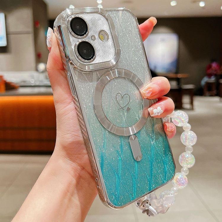 Funda para iPhone 16 Plus TPU con Purpurina Degradada Hojas de Amor Fibra de Carbono Magsafe (Azul)