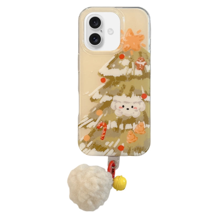 Funda híbrida TPU iPhone 16 con colgante cachorro con árbol de Navidad