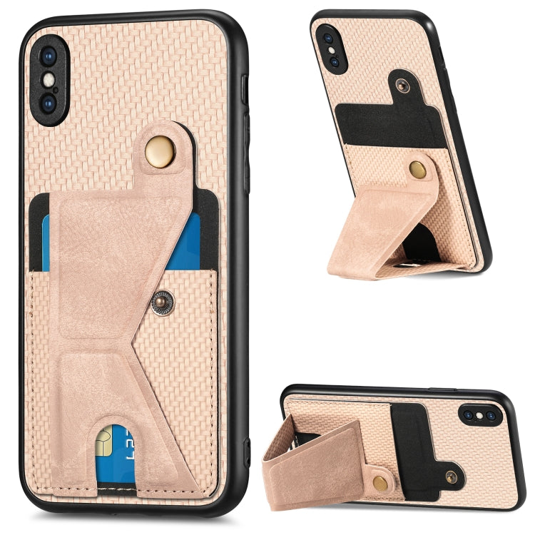 Funda para Teléfono iPhone X / Xs Cartera Fibra de Carbono Flip Card con Soporte en Forma de K (Caqui)