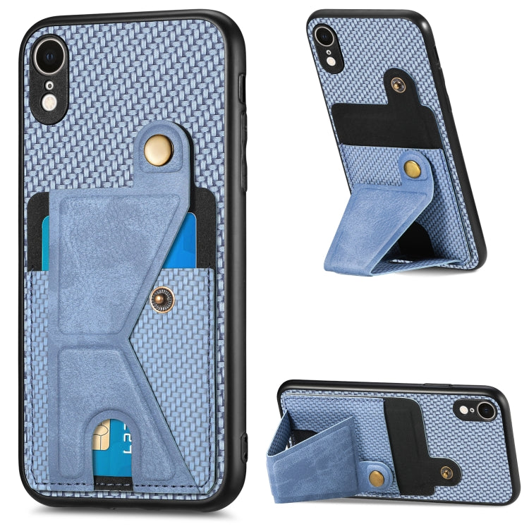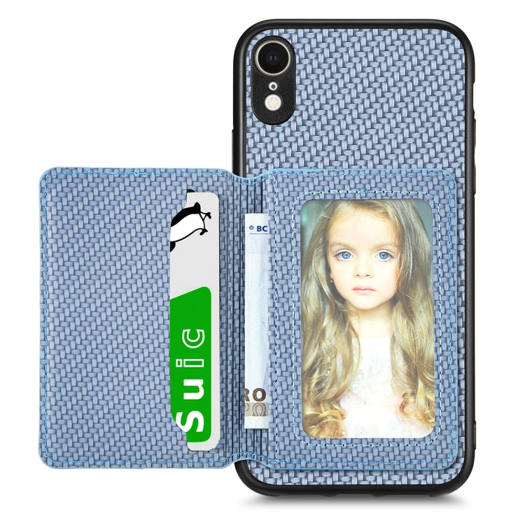 Caja de teléfono para iPhone Xr con bolsa de tarjeta magnética de fibra de carbono (Azul)