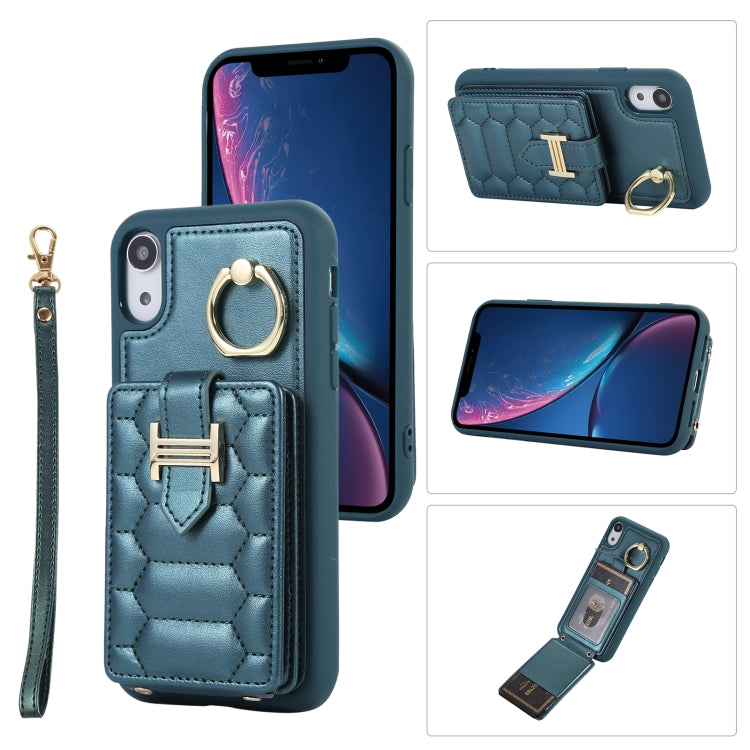 Funda para teléfono iPhone Xr Vertical Card Bag Ring Holder con doble cordón (Verde Oscuro)